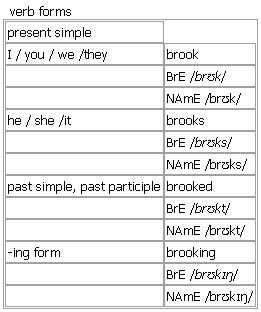 verb not brook sth/not brook sb doing sth/brook no… (formal) to not allow sth •The tone in his voice brooked no argument. •She would brook no criticism of her son. Verb forms: