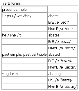 abate [abate abates abated abating] BrE [əˈbeɪt] NAmE [əˈbeɪt] verb intransitive, transitive (formal) to become less strong; to make sth less strong •The storm showed no signs of abating. •They waited for the crowd's fury to abate. •~ sth Steps are to be taken to abate pollution. Derived Word: ↑abatement Verb forms: Word Origin: Middle English (in the legal sense): from Old French abatre ‘to fell’, from a- (from Latin ad ‘to, at’) + batre ‘to beat’ (from Latin battere, battuere ‘to beat’).