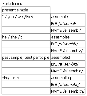 as·sem·ble AW [assemble assembles assembled assembling] BrE [əˈsembl] NAmE [əˈsembl] verb 1. intransitive, transitive to come together as a group; to bring people or things together as a group •All the students were asked to assemble in the main hall. •She then addressed the assembled company (= all the people there). •~ sth to assemble evidence/data •The manager has assembled a world-class team. •He tried to assemble his thoughts. 2. transitive ~ sth to fit together all the separate parts of sth, for example a piece of furniture •The shelves are easy to assemble. Opp: ↑disassemble Verb forms: Word Origin: Middle English: from Old French asembler, based on Latin ad- ‘to’ + simul ‘together’. Synonyms: build construct • assemble • erect • put sth up These words all mean to make sth, especially by putting different parts together. build • to make sth, especially a building, by putting parts together: ▪ a house built of stone ◇ ▪ They're going to build on the site of the old power station. construct • [often passive] (rather formal) to build sth such as a road, building or machine assemble • (rather formal) to fit together all the separate parts of sth such as a piece of furniture or a machine: ▪ The cupboard is easy to assemble. erect • (formal) to build sth; to put sth in position and make it stand upright: ▪ Police had to erect barriers to keep crowds back. put sth up • to build sth or place sth somewhere: ▪ They're putting up new hotels in order to boost tourism in the area. to build/construct/erect/put up a house/wall to build/construct/erect/put up some shelves to build/construct/erect/put up a barrier/fence/shelter to build/construct/assemble a(n) engine/machine to build/construct a road/railway/railroad/tunnel to erect/put up a tent/statue/monument Example Bank: •I've already begun to assemble my team for the job. •The French began to assemble an army •The shelves are available in kit form or fully assembled. •We had assembled for the first rehearsal. •a hastily assembled force of warriors •the force that permits atoms to assemble into molecules •She then addressed the assembled company. •The company assembles vehicles for Renault and Toyota. •The students were asked to assemble in the hall.