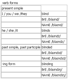blind [blind blinds blinded blinding blinder blindest] adjective, verb, noun, adverb BrE [blaɪnd] NAmE [blaɪnd] adjective (blind·er, blind·est) 1. not able to see • Doctors think he will go blind. •blind and partially sighted people • One of her parents is blind. 2. the blindnoun plural people who are blind •recorded books for the blind •guide dogs for the blind 3. ~ (to sth) not noticing or realizing sth •She is blind to her husband's faults. •I must have been blind not to realize the danger we were in. 4. usually before noun (of strong feelings)seeming to be unreasonable, and accepted without question; seeming to be out of control •blind faith/obedience •It was a moment of blind panic. 5. usually before noun (of a situation or an event)that cannot be controlled by reason •blind chance •the blind force of nature 6. that a driver in a car cannot see, or cannot see around •a blind driveway •a blind bend/corner see also ↑blindly more at love is blind at ↑love n. Word Origin: Old English, of Germanic origin; related to Dutch and German blind. Which Word?: blind / blindly There are two adverbs that come from the adjective blind. Blindly means ‘not being able to see what you are doing’ or ‘not thinking about something’. The adverb blind is mainly used in the context of flying and means ‘without being able to see’, ‘using instruments only’. Example Bank: •His own problems have made him completely blind to the sufferings of others. •Is the public wilfully/willfully blind to what is going on? •She went blind at the age of ten. •She's totally blind to her husband's faults. Idioms: ↑blind as a bat ▪ ↑blind drunk ▪ ↑blind leading the blind ▪ ↑blind somebody with science ▪ ↑not a blind bit blindest bit of … ▪ ↑turn a blind eye Derived Word: ↑blindness verb 1. ~ sb to permanently destroy sb's ability to see •She was blinded in the explosion. •The attackers blinded him with acid. 2. ~ sb/sth to make it difficult for sb to see for a short time •When she went outside she was temporarily blinded by the sun. •His eyes were blinded by tears. 3. ~ sb (to sth) to make sb no longer able to think clearly or behave in a sensible way •His sense of loyalty blinded him to the truth. more at eff and blind at ↑eff Verb forms: Word Origin: Old English, of Germanic origin; related to Dutch and German blind. Example Bank: •The strong light almost blinded him. noun 1. (NAmE also shade, ˈwindow shade)countable a covering for a window, especially one made of a roll of cloth that is fixed at the top of the window and can be pulled up and down see also ↑venetian blind 2. singular something people say or do to hide the truth about sth in order to trick other people Word Origin: Old English, of Germanic origin; related to Dutch and German blind. Example Bank: •She saw a figure through the blinds. •Pull up the blinds and let some light in. adverb (in connection with flying) without being able to see; using instruments only more at rob sb blind at ↑rob, swear blind at ↑swear Word Origin: Old English, of Germanic origin; related to Dutch and German blind. Which Word?: blind / blindly There are two adverbs that come from the adjective blind. Blindly means ‘not being able to see what you are doing’ or ‘not thinking about something’. The adverb blind is mainly used in the context of flying and means ‘without being able to see’, ‘using instruments only’. See also: ↑shade ▪ ↑window shade
