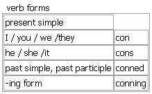 con [con cons conned conning] noun, verb BrE [kɒn] NAmE [kɑːn] noun (informal) 1. singular (also BrE formal ˈconfidence trick) (also NAmE formal ˈconfidence game)a trick; an act of cheating sb •The so-called bargain was just a big con! • (BrE)a con trick • (NAmE)a con game •He's a real con artist (= a person who regularly cheats others). see also ↑con man, ↑mod cons 2. countable = ↑convict, see the pros and cons at ↑pro n. Word Origin: n. sense 1 and v. late 19th cent. ↑confidence confidence trick n. sense 2 late 19th cent. Example Bank: •The scheme was all a big con. •He's a real con artist. •It was all one big con trick. •Look, I'm an officer, and cons don't speak to me like that, okay? •The so-called bargain was just a con! verb (-nn-)(informal) to trick sb, especially in order to get money from them or persuade them to do sth for you •~ sb (into doing sth) I was conned into buying a useless car. •~ sb (out of sth) They had been conned out of £100 000. •~ your way into sth He conned his way into the job using false references. Verb forms: Word Origin: n. sense 1 and v. late 19th cent. ↑confidence confidence trick n. sense 2 late 19th cent. Synonyms: cheat fool • deceive • betray • take in • trick • con These words all mean to make sb believe sth that is not true, especially in order to get what you want. cheat • to make sb believe sth that is not true, in order to get money or sth else from them: ▪ She is accused of attempting to cheat the taxman. ◇ ▪ He cheated his way into the job. Cheat also means to act in a dishonest way in order to gain an advantage, especially in a game, competition or exam: ▪ You're not allowed to look at the answers— ▪ that's cheating ▪. fool • to make sb believe sth that is not true, especially in order to laugh at them or to get what you want: ▪ Just don't be fooled into investing any money with them. deceive • to make sb believe sth that is not true, especially sb who trusts you, in order to get what you want: ▪ She deceived him into handing over all his savings. betray • to hurt sb who trusts you, especially by deceiving them or not being loyal to them: ▪ She felt betrayed when she found out the truth about him. take sb in • [often passive] to deceive sb, usually in order to get what you want: ▪ I was taken in by her story. trick • to deceive sb, especially in a clever way, in order to get what you want. con • (informal) to deceive sb, especially in order to get money from them or get them to do sth for you: ▪ They had been conned out of £100 000. which word? Many of these words involve making sb believe sth that is not true, but some of them are more disapproving than others. Deceive is probably the worst because people typically deceive friends, relations and others who know and trust them. People may feel cheated/betrayed by sb in authority who they trusted to look after their interests. If sb takes you in, they may do it by acting a part and using words and charm effectively. If sb cheats/fools/tricks/cons you, they may get sth from you and make you feel stupid. However, sb might fool you just as a joke; and to trick sb is sometimes seen as a clever thing to do, if the person being tricked is seen as a bad person who deserves it. to cheat/fool/trick/con sb out of sth to cheat/fool/deceive/betray/trick/con sb into doing sth to feel cheated/fooled/deceived/betrayed/tricked/conned to fool/deceive yourself to cheat/trick/con your way into sth See also: ↑confidence game ▪ ↑confidence trick