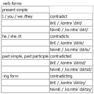 con·tra·dict AW [contradict contradicts contradicted contradicting] BrE [ˌkɒntrəˈdɪkt] NAmE [ˌkɑːntrəˈdɪkt] verb 1. to say that sth that sb else has said is wrong, and that the opposite is true •~ sth All evening her husband contradicted everything she said. •~ sb/yourself You've just contradicted yourself (= said the opposite of what you said before). •~ (sb) + speech ‘No, it's not,’ she contradicted (him). 2. ~ sth | ~ each other (of statements or pieces of evidence)to be so different from each other that one of them must be wrong •The two stories contradict each other. •This version of events was contradicted by eye-witness reports. Verb forms: Word Origin: late 16th cent.: from Latin contradict- ‘spoken against’, from the verb contradicere, originally contra dicere ‘speak against’. Language Bank: evidence Giving proof There is clear evidence that ▪ TV advertising influences what children buy. It is clear ▪ from numerous studies that ▪ TV advertising influences what children buy. ▪ Recent research demonstrates ▪ that TV advertising influences children's spending habits. ▪ Many parents think that TV advertising influences their children. This view is supported by ▪ the findings of a recent study, which show ▪ a clear link between television advertisements and children's spending habits. ▪ The findings also reveal ▪ that most children are unaware of the persuasive purpose of advertising. There is little evidence that ▪ children understand the persuasive intent of advertising. ▪ The results contradict ▪ claims that advertising is unrelated to children's spending habits. ▪ Manufacturers argue that it is difficult to prove ▪ that advertising alone influences what children buy. Language Banks at ↑argue, ↑e.g., ↑illustrate Example Bank: •This version of events was contradicted by eyewitness reports. •You've just contradicted yourself.