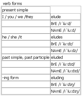 elude [elude eludes eluded eluding] BrE [iˈluːd] NAmE [iˈluːd] verb 1. ~ sb/sth to manage to avoid or escape from sb/sth, especially in a clever way •The two men managed to elude the police for six weeks. 2. ~ sb if sth eludes you, you are not able to achieve it, or not able to remember or understand it •He was extremely tired but sleep eluded him. •They're a popular band but chart success has eluded them so far. •Finally he remembered the tiny detail that had eluded him the night before. Verb forms: Word Origin: mid 16th cent. (in the sense ‘delude, baffle’): from Latin eludere, from e- (variant of ex-) ‘out, away from’ + ludere ‘to play’. Example Bank: •The point of the exercise seemed to elude the class. •Winning this championship was a prize that had always eluded him. •the higher levels of responsibility that have continued to elude women •the success that has so far eluded her •How did the killer elude detection for so long?