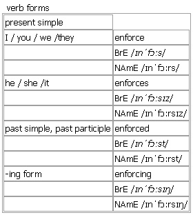 en·force AW [enforce enforces enforced enforcing] BrE [ɪnˈfɔːs] NAmE [ɪnˈfɔːrs] verb