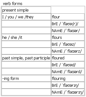 flour [flourfloursflouredflouring] noun, verb BrE [ˈflaʊə(r)] NAmE [ˈflaʊər] noun uncountable a fine white or brown powder made from grain, especially ↑wheat, and used in cooking for making bread, cakes, etc. see also ↑plain flour, ↑self-raising flour