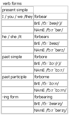 for·bear [forbear forbears forbore forbearing] verb, noun verb BrE [fɔːˈbeə(r)] ; NAmE [fɔːrˈber] (for·boreBrE [fɔːˈbɔː(r)] ; NAmE [fɔːrˈbɔːr] , for·borneBrE [fɔːˈbɔːn] ; NAmE [fɔːrˈbɔːrn] )intransitive, transitive (formal) to stop yourself from saying or doing sth that you could or would like to say or do •~ (from sth/from doing sth) He wanted to answer back, but he forbore from doing so. •~ to do sth She forbore to ask any further questions. Verb forms: Word Origin: v. Old English forberan (from for- and ↑bear (verb)). The original senses were ‘endure, bear with’, hence ‘endure the absence of, do without’, also ‘control oneself’, hence ‘refrain from’ (Middle English). noun = ↑forebear Word Origin: v. Old English forberan (from for- and ↑bear (verb)). The original senses were ‘endure, bear with’, hence ‘endure the absence of, do without’, also ‘control oneself’, hence ‘refrain from’ (Middle English).