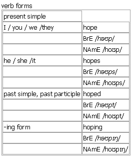 hope [hope hopes hoped hoping] verb, noun BrE [həʊp] NAmE [hoʊp] verb intransitive, transitive to want sth to happen and think that it is possible •~ (for sth) We are hoping for good weather on Sunday. • All we can do now is wait and hope. •‘Do you think it will rain?’ ‘ I hope not.’ •‘Will you be back before dark?’ ‘ I hope so, yes.’ •The exam went better than I'd dared hope. •I'll see you next week, I hope. •~ (that)… I hope (that) you're okay. •I can only hope (that) there has been some mistake. •Detectives are hoping (that) witnesses will come forward. •Let's hope we can find a parking space. •it is hoped (that)… It is hoped that over £10 000 will be raised. •~ to do sth She is hoping to win the gold medal. •We hope to arrive around two. •What had he hoped to achieve? Hope can be used in the passive in the form it is hoped that…. For must always be used with hope in other passive sentences •The improvement that had been hoped for never came. •The hoped-for improvement never came. more at cross my heart (and hope to die) at ↑cross v. Verb forms: Word Origin: late Old English hopa (noun), hopian (verb), of Germanic origin; related to Dutch hoop (noun), hopen (verb), and German hoffen (verb). Thesaurus: hope verb I, T •We're hoping for good weather on Sunday. wish • • aspire • • wait • • set your heart on sth • |especially journalism set your sights on sth • Opp: despair of sth hope/wish/wait for sth hope/wish that… hope/aspire/wait to do sth Example Bank: •He secretly hoped that she wouldn't be home. •I hardly dared to hope the plan would succeed. •I only hope you're right. •I sincerely hope that you will be successful. •They hoped desperately that their missing son would come home. •We are hoping for good weather. •‘Do you think it will rain?’ ‘ I hope not.’ •‘Will you be back before dark?’ ‘ I hope so, yes.’ •I can only hope there has been some mistake. •Let's hope we can find a parking space. •The exam went better than I'd dared hope. •We're hoping for good weather on Sunday. Idioms: ↑I should hope so ▪ ↑beyond hope ▪ ↑hold out little hope ▪ ↑hope against hope ▪ ↑hope for the best ▪ ↑hope springs eternal ▪ ↑in the hope of something ▪ ↑in the hope that … ▪ ↑not have a hope ▪ not hold out any/much hope ▪ ↑so I should hope ▪ ↑some hope! noun 1. uncountable, countable a belief that sth you want will happen •~ (of sth) There is now hope of a cure. •~ (for sb/sth) Hopes for the missing men are fading. •~ (that…) There is little hope that they will be found alive. •~ (of doing sth) They have given up hope of finding any more survivors. •She has high hopes of winning (= is very confident about it). •The future is not without hope. •Don't raise your hopes too high, or you may be disappointed. •I'll do what I can, but don't get your hopes up. •There is still a glimmer of hope. •The situation is not good but we live in hope that it will improve. 2. countable ~ (of/for sth) | ~ (for sb) | ~ (that…) | ~ (of doing sth) something that you wish for • She told me all her hopes, dreams and fears. • They have high hopes for their children. 3. countable, usually singular ~ (of sth) | ~ (for sb) a person, a thing or a situation that will help you get what you want • He turned to her in despair and said, ‘You're my last hope.’ • The operation was Kelly's only hope of survival. more at dash sb's hopes at ↑dash v., pin (all) your hopes on sb/sth at ↑pin v. Word Origin: late Old English hopa (noun), hopian (verb), of Germanic origin; related to Dutch hoop (noun), hopen (verb), and German hoffen (verb). Thesaurus: hope noun 1. U, C •There is no hope of finding any more survivors. optimism • • expectancy • • wishful thinking • Opp: despair, Opp: hopelessness hope/optimism for sth hope/optimism that… express/share your hope/optimism 2. C •They have high hopes for their children. dream • • ambition • • aspiration • • expectation • • fantasy • Opp: fear hopes/aspirations/expectations for sth high hopes/ambitions/aspirations/expectations have hopes/a dream/an ambition/aspirations/expectations/a fantasy fulfil your hopes/dreams/ambitions/aspirations/expectations/fantasies Example Bank: •He had one last hope to cling to. •He pinned all his hopes on getting that job. •He represents our best hope for a swimming medal. •He secretly cherished hopes that George would marry his daughter. •He turned to her in despair and said, ‘You're my last hope.’ •He wasn't trying to give her false hope. •Her dark eyes lit with sudden hope. •Her hopes of going to college have now been dashed. •Her only hope lay in escape. •His early hopes of freedom were now gone. •Hope faded after wrecked remains of the ship were washed onto the shore. •Hope flared up inside her. •Hope remains that survivors will be found. •Hopes are high that a resolution to the conflict can be found. •Hopes of a peaceful end to the strike are now growing. •I am writing this letter in hopes that it will be forwarded to the editor. •I am writing to you in the hope that you can help me obtain some information. •I didn't give up hope of being released. •I don't hold out much hope of finding a buyer. •I have no hope of winning. •I haven't yet found a flat, but I live in hope. •I looked at her and felt a glimmer of hope. •I'll see what I can do, but don't get your hopes up too much. •It is important to keep alive the hope that a peace settlement might be found. •It is my fervent hope that you will be able to take this project forward. •It is my sincere hope that she will find happiness at last. •It seemed a forlorn hope that we would find a taxi. •Lord Mountbatten secretly cherished hopes that Charles would marry his granddaughter. •Maybe we can find some hope for humanity af
