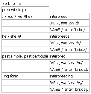 inter·breed f57 [interbreed interbreeds interbred interbreeding] BrE [ˌɪntəˈbriːd] NAmE [ˌɪntərˈbriːd] verb intransitive, transitive ~ (sth) (with sth) if animals from different ↑species interbreed, or sb interbreeds them, they produce young together Verb forms: