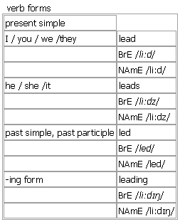 ▪ I. lead 1 [lead leads led leading] verb, noun BrE [liːd] NAmE [liːd] see also ↑lead 2 verb (led, ledBrE [led] ; NAmE [led] ) SHOW THE WAY 1. intransitive, transitive to go with or in front of a person or an animal to show the way or to make them go in the right direction Syn: ↑guide • If you lead, I'll follow. •~ sb/sth + adv./prep. He led us out into the grounds. •The receptionist led the way to the boardroom. •She led the horse back into the stable. • (figurative)I tried to lead the discussion back to the main issue. CONNECT TWO THINGS 2. intransitive ~ from/to sth (to/from sth) to connect one object or place to another •the pipe leading from the top of the water tank • The wire led to a speaker. OF ROAD/PATH/DOOR 3. intransitive, transitive to go in a particular direction or to a particular place •+ adv./prep. A path led up the hill. • Which door leads to the yard? •~ sb + adv./prep. The track led us through a wood. CAUSE 4. intransitive ~ to sth to have sth as a result Syn: result in • Eating too much sugar can lead to health problems. • A reward was offered for information leading to an arrest. 5. transitive to be the reason why sb does or thinks sth •~ sb (to sth) What led you to this conclusion? • He's too easily led (= easily persuaded to do or think sth). •~ sb to do sth This has led scientists to speculate on the existence of other galaxies. •The situation is far worse than we had been led to believe. LIFE 6. transitive ~ sth to have a particular type of life •to lead a quiet life/a life of luxury/a miserable existence BE BEST/FIRST 7. transitive, intransitive to be the best at sth; to be in first place •~ (sb/sth) (in sth) The department led the world in cancer research. • We lead the way in space technology. •~ (sb/sth) by sth The champion is leading (her nearest rival) by 18 seconds. BE IN CONTROL 8. transitive, intransitive ~ (sth) to be in control of sth; to be the leader of sth •to lead an expedition •to lead a discussion • Who will lead the party in the next election? IN CARD GAMES 9. intransitive, transitive to play first; to play sth as your first card • It's your turn to lead. •~ sth to lead the ten of clubs Syn: ↑mislead, see the blind leading the blind at ↑blind adj., you can lead/take a horse to water, but you can't make it drink at ↑horse n., lead/live the life of Riley at ↑life, one thing leads to another at ↑thing Verb forms: Word Origin: Old English lǣdan Germanic Dutch leiden German leiten ↑load ↑lode Thesaurus: lead verb 1. T, I •The survivors were led to safety. take • • escort • • show • • walk • • guide • • usher • |formal accompany • Opp: follow lead/take/escort/show/walk/guide/usher/accompany sb to/out of/into sth lead/take/escort/walk/guide/usher/accompany sb there/somewhere lead/take/escort/show/walk/guide sb round/around lead/show the way 2. I, T (always used with an adverb or preposition) •A path leads to the beach. go • • continue • • reach • • stretch • • extend • lead/go/continue/reach/stretch/extend beyond/across sth lead/go/continue/reach/stretch/extend from sth to sth 3. T •What led you to this conclusion? prompt • • make • • motivate • |formal induce • • predispose • lead/predispose sb to sth lead/prompt/motivate/induce/predispose sb to do sth make sb do sth 4. I, T •The champion is leading by 18 seconds. •They lead the world in cancer research. be ahead of sb • • leave sb/sth behind • • get ahead • • overtake • • pass • |written, especially business outpace • Opp: trail lead/be ahead of sb/leave sb behind/get ahead/overtake in sth lead/be ahead of sb/overtake a rival 5. T, I •He led an expedition to the North Pole. head • • chair • • captain • |formal preside • |especially journalism spearhead • lead/head/captain a team lead/head a (political) party/the government lead/head/chair/preside over a/an commission/committee/inquiry Head or lead? A person who heads sth has the official position of being the head of it. A person who leads sth may also have an official position, but the verb lead emphasizes their leadership qualities. An individual usually heads sth, but a group of people can lead sth. Language Bank: cause X causes Y ▪ Childhood obesity can cause ▪ / lead to ▪ long-term health problems. ▪ Changes in lifestyle and diet over the last twenty years have caused ▪ / led to ▪ / resulted in ▪ a sharp increase in childhood obesity. ▪ Several factors, including changes in diet and lifestyle, have contributed to ▪ the increase in childhood obesity. ▪ Research suggests that fast food and soft drinks directly contribute to ▪ childhood obesity. ▪ Genetics, lifestyle and diet are ▪ all important factors ▪ in cases of childhood obesity. ▪ Even small changes in lifestyle and diet can bring about ▪ significant weight loss. Language Banks at ↑because of, ↑consequently, ↑therefore Synonyms: take lead • escort • drive • show • walk • guide • usher • direct These words all mean to go with sb from one place to another. take • to go with sb from one place to another, for example in order to show them sth or to show them the way to a place: ▪ It's too far to walk— I'll take you by car. lead • to go with or go in front of sb in order to show them the way or to make them go in the right direction: ▪ Firefighters led the survivors to safety. escort • to go with sb in order to protect or guard them or to show them the way: ▪ The president arrived, escorted by twelve bodyguards. drive • to take sb somewhere in a car, taxi, etc: ▪ My mother drove us to the airport. show • to take sb to a particular place, in the right direction, or along the correct route: ▪ The attendant showed us to our seats. walk • to go somewhere with sb on foot, especially in order to make sure that they get there safely; to take an animal, e