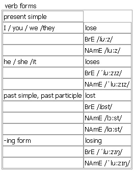 lose [lose loses lost losing] BrE [luːz] NAmE [luːz] verb (lost, lostBrE [lɒst] ; NAmE [lɔːst] ; [lɑːst] ) NOT FIND 1. transitive ~ sth/sb to be unable to find sth/sb Syn: ↑mislay • I've lost my keys. • The tickets seem to have got lost. •She lost her husband in the crowd. HAVE STH/SB TAKEN AWAY 2. transitive ~ sth/sb to have sth/sb taken away from you as a result of an accident, getting old, dying, etc • She lost a leg in a car crash. •to lose your hair/teeth (= as a result of getting old) • He's lost his job. •Some families lost everything (= all they owned) in the flood. •They lost both their sons (= they were killed) in the war. •The ship was lost at sea (= it sank). •Many people lost their lives (= were killed). 3. transitive ~ sth (to sb/sth) to have sth taken away by sb/sth • The company has lost a lot of business to its competitors. 4. transitive ~ sth to have to give up sth; to fail to keep sth • You will lose your deposit if you cancel the order. • Sit down or you'll lose your seat. HAVE LESS 5. transitive ~ sth to have less and less of sth, especially until you no longer have any of it • He lost his nerve at the last minute. • She seemed to have lost interest in food. •At that moment he lost his balance and fell. •I've lost ten pounds since I started this diet. •The train was losing speed. NOT WIN 6. transitive, intransitive to be defeated; to fail to win a competition, a court case, an argument, etc •~ sth (to sb) to lose a game/a race/an election/a battle/a war •~ to sb We lost to a stronger team. •~ (sth) (by sth) He lost by less than 100 votes. NOT KEEP 7. transitive, intransitive to fail to keep sth you want or need, especially money; to cause sb to fail to keep sth •~ sth The business is losing money. • Poetry always loses something in translation. •~ sth (on sth/by doing sth) You have nothing to lose by telling the truth. •~ on sth/by doing sth We lost on that deal. •~ sb sth His carelessness lost him the job. NOT UNDERSTAND/HEAR 8. transitive ~ sth to fail to get, hear or understand sth •His words were lost (= could not be heard) in the applause. 9. transitive ~ sb (informal)to be no longer understood by sb •I'm afraid you've lost me there. ESCAPE 10. transitive ~ sb/sth to escape from sb/sth Syn: ↑evade, Syn: shake off •We managed to lose our pursuers in the darkness. TIME 11. transitive ~ sth to waste time or an opportunity • We lost twenty minutes changing a tyre. • Hurry— there's no time to lose! •He lost no time in setting out for London. 12. transitive, intransitive ~ (sth) if a watch or clock loses or loses time, it goes too slowly or becomes a particular amount of time behind the correct time •This clock loses two minutes a day. Opp: ↑gain Rem: Most idioms containing lose are at the entries for the nouns and adjectives in the idioms, for example lose your bearings is at bearing. Idiom: ↑lose it Derived: ↑lose out ▪ ↑lose out to somebody ▪ ↑lose yourself in something Verb forms: Word Origin: Old English losian ‘perish, destroy’, also ‘become unable to find’, from los ‘loss’. Thesaurus: lose verb 1. T •I've lost my keys. forget • • leave • |especially BrE, formal mislay • Opp: find lose/forget/leave/mislay your keys/wallet/bag 2. I, T •So far we haven't lost a game. trail • • come off worse/worst • Opp: win lose/trail/come off worse in sth lose/trail by sth lose/trail badly 3. T •Hurry— there's no time to lose. disapproving waste • • throw sth away • • squander • |informal blow • • splurge • Opp: save lose/waste/throw away/squander/blow/splurge sth on sth lose/waste/throw away/squander/blow/splurge money lose/waste/throw away/squander/blow a/an fortune/chance/opportunity Example Bank: •Our company lost out to one that could offer a lower price. •The company stands to lose financially if this deal falls through. •The visiting side lost to the home team. •There was really no shame in losing to Norton at that stage of his career. •This is a game that Lazio cannot afford to lose. •We cannot afford to lose any more senior members of staff. •We lost against Albyn College. •We lost by five goals to two. •Win or lose, the important thing is to remain calm. •You have nothing to lose by telling the truth. •He lost the seat by less than 100 votes. •He yesterday lost his appeal against a six-month ban. •Here, tie it round your neck so you don't lose it. •Hurry— there's no time to lose. •I've lost my keys. •If your cheque book is lost or stolen inform your bank immediately. •Newcastle lost 1–0 in the rematch. •She resigned as party leader after they lost the election. •So far they haven't lost a game. •The South lost the war. •The tickets seem to have got lost. •They deserved to lose. •We lost a lot of money on that deal. •We've lost Alfie— is he with you?