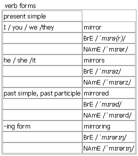 verb 1.~ sth to have features that are similar to sth else and which show what it is like Syn: ↑reflect •The music of the time mirrored the feeling of optimism in the country. 2.~ sb/sth to show the image of sb/sth on the surface of water, glass, etc. Syn: ↑reflect •She saw herself mirrored in the window. Verb forms: