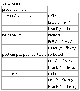 re·flect [reflect reflects reflected reflecting] BrE [rɪˈflekt] NAmE [rɪˈflekt] verb 1. transitive, usually passive ~ sb/sth (in sth) to show the image of sb/sth on the surface of sth such as a mirror, water or glass • His face was reflected in the mirror. • She could see herself reflected in his eyes. 2. transitive ~ sth to throw back light, heat, sound, etc. from a surface • The windows reflected the bright afternoon sunlight. • When the sun's rays hit the earth, a lot of the heat is reflected back into space. •This material absorbs the sound, and doesn't reflect it. 3. transitive ~ sth to show or be a sign of the nature of sth or of sb's attitude or feeling • Our newspaper aims to reflect the views of the local community. • His music reflects his interest in African culture. 4. intransitive, transitive to think carefully and deeply about sth • Before I decide, I need time to reflect. •~ on/upon sth She was left to reflect on the implications of her decision. •~ that… On the way home he reflected that the interview had gone well. •~ how, what, etc… She reflected how different it could have been. •+ speech ‘It could all have been so different,’ she reflected. Idiom: reflect well/badly on somebody Verb forms: Word Origin: late Middle English: from Old French reflecter or Latin reflectere, from re- ‘back’ + flectere ‘to bend’. Example Bank: •He reflected ruefully that the his money didn't buy as much as it used to •He was left to reflect on the implications of his decision. •I need time to reflect. •In Milton's poem, Satan, even after his fall, dimly reflects his former glory. •Light reflects directly off a face of a crystal. •One good thing, he reflected wryly, was that none of his colleagues would find out. •Senegalese culture strongly reflects influences from Islamic rulers. •She paused to reflect on what she had achieved. •The condition of the house is reflected in its low price. •The exhibition is designed to reflect the diversity of the nation and its regions. •The punishment should adequately reflect the revulsion felt by most people for this appalling crime. •The screen reflects light from the sun. •The sun reflected dully off the stone walls. •The views expressed in this article do not necessarily reflect those of the editor. •This kind of conduct reflects very poorly on you. •This year's budget simply reflects the fact that we have fewer people out of work. •an opportune time to reflect critically on the city's past •information that may reflect negatively on research participants •Her face reflected the power of her feelings. •I paused to reflect how I would answer that question.