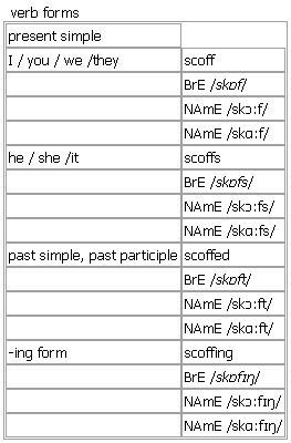 scoff [scoff scoffs scoffed scoffing] BrE [skɒf] NAmE [skɔːf] NAmE [skɑːf] verb