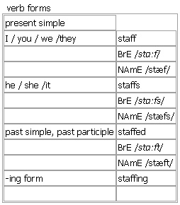 staff [staff staffs staves] noun, verb BrE [stɑːf] NAmE [stæf] noun 1. countable, usually singular, uncountable all the workers employed in an organization considered as a group •medical staff • (BrE)teaching staff • (BrE) We have 20 part-time members of staff. • (NAmE)staff members •staff development/training •a staff restaurant/meeting • (especially BrE)a lawyer on the staff of the Worldwide Fund for Nature see also ↑ground staff 2. singular (NAmE)the people who work at a school, college or university, but who do not teach students •students, faculty and staff 3. countable + singular or plural verb a group of senior army officers who help a commanding officer •a staff officer see also ↑chief of staff, ↑general staff 4. countable (old-fashioned or formal)a long stick used as a support when walking or climbing, as a weapon, or as a symbol of authority 5. (especially NAmE) (BrE also stave)countable (music)a set of five lines on which music is written Word Origin: Old English stæf (in sense 4), of Germanic origin; related to Dutch staf and German Stab. Thesaurus: staff noun C, pl. •All medical staff are tested for the virus. workforce • • workers • • employees • • manpower • • sales force • |BrE members of staff • |especially AmE staff members • |business personnel • • human resources • (a/an) skilled/unskilled/qualified/trained staff/workforce/workers/employees/personnel (a/an) female/male/experienced staff/workforce/workers/employees/members of staff/staff members/personnel a 10–strong, 2–000 strong, etc. staff/workforce/sales force train staff/the workforce/workers/employees/members of staff/staff members reduce/increase staff/the workforce/personnel Collocations: Jobs Getting a job look for work look for/apply for/go for a job get/pick up/complete/fill out/ (BrE) fill in an application (form) send/email your (BrE) CV/(NAmE) résumé/application/application form/covering letter be called for/have/attend an interview offer sb a job/work/employment/promotion find/get/land a job employ/ (especially NAmE) hire/recruit/ (especially BrE) take on staff/workers/trainees recruit/appoint a manager Doing a job arrive at/get to/leave work/the office/the factory start/finish work/your shift do/put in/work overtime have/gain/get/lack/need experience/qualifications do/get/have/receive training learn/pick up/improve/develop (your) skills cope with/manage/share/spread the workload improve your/achieve a better work-life balance have (no) job satisfaction/job security Building a career have a job/work/a career/a vocation find/follow/pursue/ (especially NAmE) live (out) your vocation enter/go into/join a profession choose/embark on/start/begin/pursue a career change jobs/profession/career be/ (both especially BrE) work/go freelance do/take on temp work/freelance work do/be engaged in/be involved in voluntary work Leaving your job leave/ (especially NAmE) quit/resign from your job give up work/your job/your career hand in your notice/resignation plan to/be due to retire in June/next year, etc. take early retirement Grammar Point: staff In BrE staff (sense 1) can be singular: ▪ a staff of ten (= a group of ten people) or plural: ▪ I have ten staff working for me. If it is the subject of a verb, this verb is plural: ▪ The staff in this shop are very helpful. In NAmE staff (senses 1 and 2) can only be singular: ▪ a staff of ten (but not ten staff). ◇ ▪ The staff in this store is very helpful. The plural form staffs is less frequent but is used in both BrE and NAmE to refer to more than one group of people: ▪ the senator and his staff (singular) ◇ ▪ senators and their staffs (plural). Example Bank: •A spokesperson said that the bank expects to make 15 000 staff redundant over the next three years. •He joined the editorial staff in 1999. •He's a staff writer for The New Yorker. •I've heard they're recruiting staff at the moment. •She has been on the staff of the hospital for most of her working life. •She's a staff scientist at the Research Institute. •Some companies are struggling to retain skilled staff. •Specialist training is necessary for staff carrying out this work. •The Wimbledon ground staff pulled the covers over the courts. •The bar staff can serve around a hundred drinks an hour. •The company has a staff of fifty. •The hospital is freezing staff appointments as part of its cutbacks. •The staff are working under pressure. •There are four full-time members of staff. •There are only four full-time members of staff in the company. •There is separate staff accommodation for the housekeeper. •They pay their staff by cheque. •We'll be down to a skeleton staff over Christmas. •a staff person for a government agency •a staff position at ‘Life’ magazine •a staff report by the House Foreign Affairs Committee •staff appointed to the project •the campaign staff of President Bush •the ground staff at the airport •the medical staff who treated him during his confinement •All medical staff are tested for the virus. •He's a lawyer on the staff of the Wordwide Fund for Nature. •I have ten staff working for me. •I tend not to eat in the staff restaurant. •Students, faculty and staff were all men in those days. •The school is closed for staff development. •The staff in this shop are very helpful. •Three staff members were suspended after the incident. •We have 20 part-time members of staff. •a staff of ten •senators and their staffs •the senator and his staff Idiom: ↑staff of life Derived Word: ↑staffing verb transitive, usually passive ~ sth to work in an institution, a company, etc; to provide people to work there • The advice centre is staffed entirely by volunteers. • The charity provided money to staff and equip two hospitals. •a fully staffed department see also ↑overstaffed, ↑short-staffed, ↑understaffed Verb forms: Word Origin: Old English 