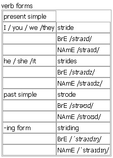 stride [stride strides strode striding stridden] verb, noun BrE [straɪd] NAmE [straɪd] verb (pt strodeBrE [strəʊd] ; NAmE [stroʊd] )intransitive (not used in the perfect tenses)+ adv./prep. to walk with long steps in a particular direction •We strode across the snowy fields. •She came striding along to meet me. Verb forms: Word Origin: Old English stride (noun) ‘single long step’, strīdan (verb) ‘stand or walk with the legs wide apart’, probably from a Germanic base meaning ‘strive, quarrel’; related to Dutch strijden ‘fight’ and German streiten ‘quarrel’. Example Bank: •He came striding up the path. •He strode off in search of a taxi. •She strode purposefully across the stage. •She strode purposefully towards the door. •Andrew strode out briskly along the rocky track. •He strode past her into the hall. •Martha came striding out to meet me. •She strode angrily into his office. •The man strode confidently onto the stage. •We could see her striding across the grass towards the house. Idioms: ↑get into your stride ▪ ↑put somebody off their stride ▪ ↑stride for stride ▪ ↑take something in your stride ▪ ↑without breaking stride noun 1. one long step; the distance covered by a step Syn: ↑pace •He crossed the room in two strides. •I was gaining on the other runners with every stride. 2. your way of walking or running •his familiar purposeful stride •She did not slow her stride until she was face to face with us. 3. an improvement in the way sth is developing •We're making great strides in the search for a cure. 4. stridesplural (AustralE, informal)trousers/pants Word Origin: Old English stride (noun) ‘single long step’, strīdan (verb) ‘stand or walk with the legs wide apart’, probably from a Germanic base meaning ‘strive, quarrel’; related to Dutch strijden ‘fight’ and German streiten ‘quarrel’. Example Bank: •He matched his stride to her slower pace. •In one short stride he reached the window. •She's made enormous strides in English this term. •The show finally hit its stride in the second season. •The team took time to get into their stride. •We have made great strides in areas like employment and housing. •Without breaking her stride she ducked the ball. •First you'll need to measure the length of your stride. •He entered the clearing with his familiar, purposeful stride. •I was gaining on the other runners with every stride. •Rooney scored from 20 metres without breaking (his) stride. •She lengthened her stride to try and keep up with him. •She moved towards him in quick strides. •She resumed her confident stride. See also: ↑hit stride ▪ ↑take something in stride