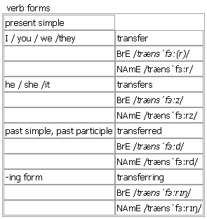 trans·fer AW [transfer transfers transferred transferring] verb, noun verb BrE [trænsˈfɜː(r)] ; NAmE [trænsˈfɜːr] (-rr-) TO NEW PLACE 1. intransitive, transitive to move from one place to another; to move sth/sb from one place to another •~ (from…) (to…) The film studio is transferring to Hollywood. • (especially NAmE) If I spend a semester in Madrid, will my credits transfer? •~ sth/sb (from…) (to…) How can I transfer money from my bank account to his? •The patient was transferred to another hospital. • (especially NAmE)I couldn't transfer all my credits from junior college. TO NEW JOB/SCHOOL/SITUATION 2. intransitive, transitive to move from one job, school, situation, etc. to another; to arrange for sb to move •~ (from…) (to…) Children usually transfer to secondary school at 11 or 12. • He transferred to UCLA after his freshman year. •~ sb (from…) (to…) Ten employees are being transferred from the sales department. FEELING/DISEASE/POWER 3. transitive, intransitive ~ (sth) (from…) (to…) if you transfer a feeling, a disease, or power, etc, or if it transfers from one person to another, the second person has it, often instead of the first •Joe had already transferred his affections from Lisa to Cleo. •I decided to transfer my loyalty to my local team. •This disease is rarely transferred from mother to baby (= so that the baby has it as well as the mother). PROPERTY 4. transitive ~ sth (to sb) to officially arrange for sth to belong to sb else or for sb else to control sth Syn: sign over •He transferred the property to his son. IN SPORT 5. intransitive, transitive (especially BrE)to move, or to move sb, to a different sports team, especially a professional football ( ↑soccer ) team •~ (from…) (to…) He transferred to Everton for £6 million. •~ sb (from…) (to…) He was transferred from Spurs to Arsenal for a huge fee. TO NEW VEHICLE 6. intransitive, transitive to change to a different vehicle during a journey; to arrange for sb to change to a different vehicle during a journey •~ (from…) (to…) I transferred at Bahrain for a flight to Singapore. •~ sb (from…) (to…) Passengers are transferred from the airport to the hotel by taxi. INFORMATION/MUSIC, ETC. 7. transitive, intransitive to copy information, music, an idea, etc. from one method of recording or presenting it to another; to be recorded or presented in a different way •~ sth (from sth) (to sth) You can transfer data to a memory stick in a few seconds. •~ (from sth) (to sth) The novel does not transfer well to the movies. Verb forms: Word Origin: late Middle English (as a verb): from French transférer or Latin transferre, from trans- ‘across’ + ferre ‘to bear’. The earliest use of the noun (late 17th cent.) was as a legal term in the sense ‘conveyance of property’. Example Bank: •Assets can be transferred overseas. •Can the disease be transferred across species? •Data is easily transferred electronically. •She transferred the gravy into a gravy boat. •She transferred the sauce into a china jug. •Skills cannot be transferred directly from a trainer to a trainee. •Sovereignty was formally transferred on December 27. •transferring assets abroad noun BrE [ˈtrænsfɜː(r)] ; NAmE [ˈtrænsfɜːr] CHANGE OF PLACE/JOB/SITUATION 1. uncountable, countable the act of moving sb/sth from one place, group or job to another; an occasion when this happens •electronic data transfer •the transfer of currency from one country to another • He has asked for a transfer to the company's Paris branch. • After the election there was a swift transfer of power. IN SPORT 2. uncountable, countable the act of moving a sports player from one club or team to another •It was the first goal he had scored since his transfer from Chelsea. •a transfer fee •to be on the transfer list (= available to join another club) CHANGE OF VEHICLE 3. uncountable, countable an act of changing to a different place, vehicle or route when you are travelling •The transfer from the airport to the hotel is included in the price. TRAIN/BUS TICKET 4. countable (NAmE)a ticket that allows a passenger to continue their journey on another bus or train PICTURE 5. countable (especially BrE) (NAmE usually decal)a picture or design that can be removed from a piece of paper and stuck onto a surface, for example by being pressed or heated PSYCHOLOGY 6. uncountable (psychology)the process of using behaviour which has already been learned in one situation in a new situation see also ↑language transfer Word Origin: late Middle English (as a verb): from French transférer or Latin transferre, from trans- ‘across’ + ferre ‘to bear’. The earliest use of the noun (late 17th cent.) was as a legal term in the sense ‘conveyance of property’. Example Bank: •Her boss recommended a permanent transfer overseas. •His club have given him a free transfer. •I did a file transfer from one PC to another. •Only the owner can make a transfer of goods. •The law schools accept a large number of second-year transfer students. •The war caused a massive transfer of population. •There has been a net transfer of lower-paid people away from the inner cities. •data transfer rates of 6.4 GB per second •the smooth transfer of power to the new government •the transfer of power/sovereignty •the transfer of property between private buyers See also: ↑decal