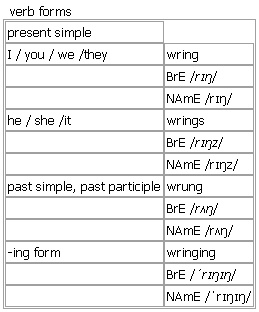 wring [wringwringswrungwringing] BrE [rɪŋ] NAmE [rɪŋ] verb (wrung, wrungBrE [rʌŋ] ; NAmE [rʌŋ] ) 1.~ sth (out) to twist and squeeze clothes, etc. in order to get the water out of them 2.~ sth if you wring a bird's neck, you twist it in order to kill the bird Idioms: ↑wring somebody's hand▪ ↑wring somebody's neck▪ ↑wring your hands Derived: ↑wring something out of somebody Verb forms: