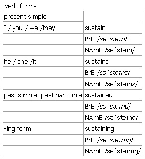sus·tain AW [sustain sustains sustained sustaining] BrE [səˈsteɪn] NAmE [səˈsteɪn] verb 1. ~ sb/sth to provide enough of what sb/sth needs in order to live or exist •Which planets can sustain life? •I only had a little chocolate to sustain me on my walk. •The love and support of his family sustained him during his time in prison. •When she lost her job they could no longer sustain their expensive lifestyle. 2. ~ sth to make sth continue for some time without becoming less Syn: ↑maintain •a period of sustained economic growth •a sustained attack •She managed to sustain everyone's interest until the end of her speech. •Kangaroos can sustain high speeds over long distances. •the sustaining pedal of a piano (= that allows a note to continue sounding for a long time) 3. ~ sth (formal)to experience sth bad Syn: ↑suffer •to sustain damage/an injury/a defeat •The company sustained losses of millions of dollars. 4. ~ sth to provide evidence to support an opinion, a theory, etc. Syn: ↑uphold •The evidence is not detailed enough to sustain his argument. 5. ~ sth (formal)to support a weight without breaking or falling Syn: ↑bear •The ice will not sustain your weight. 6. ~ sth (law)to decide that a claim, etc. is valid Syn: ↑uphold •The court sustained his claim that the contract was illegal. •Objection sustained! (= said by a judge when a lawyer makes an ↑objection in court) Verb forms: Word Origin: Middle English: from Old French soustenir, from Latin sustinere, from sub- ‘from below’ + tenere ‘hold’. Example Bank: •The government will find it hard to sustain this economic growth. •The soil was so badly eroded it could no longer sustain crop production. •This relationship would be very difficult to sustain. •Objection sustained! •She had been the victim of a sustained attack. •She managed to sustain everyone's interest until the end of her speech. •The ship had sustained damage to its hull. •We are experiencing a period of sustained economic growth.