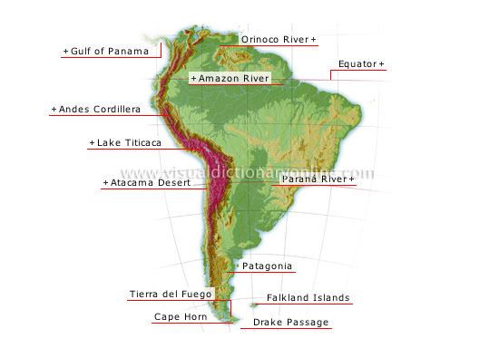 1. a continent in the western hemisphere connected to North America by the Isthmus of Panama (Freq. 3) • Derivationally related forms: South American • Members of this Region: Latin America • Instance Hypernyms: continent • Part Holonyms: western hemisphere, occident, New World, West, Occident, southern hemisphere, America • Member Meronyms: South American • Part Meronyms: South American country, South American nation, Argentina, Argentine Republic, Chile, Republic of Chile, Colombia, Republic of Colombia, Ecuador, Republic of Ecuador, Bolivia, Republic of Bolivia, Brazil, Federative Republic of Brazil, Brasil, Guiana, Paraguay, Republic of Paraguay, Peru, Republic of Peru, Uruguay, Guiana Highlands, Venezuela, Republic of Venezuela, Uruguay River 2. the nations of the South American continent collectively - South America is an important market for goods from the United States • Derivationally related forms: South American • Hypernyms: collection, aggregation, accumulation, assemblage • Member Meronyms: American