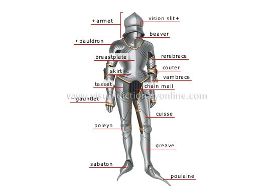 1. protective covering made of metal and used in combat (Freq. 2) • Syn: armour • Derivationally related forms: armourer (for: armour), armour (for: armour), armorer • Hypernyms: protective covering, protective cover, protection • Hyponyms: body armor, body armour, suit of armor, suit of armour, coat of mail, cataphract, shield, buckler 2. a military unit consisting of armored fighting vehicles • Syn: armour • Derivationally related forms: arm • Topics: military, armed forces, armed services, military machine, war machine • Hypernyms: military unit, military force, military group, force 3. tough more-or-less rigid protective covering of an animal or plant • Syn: armour • Hypernyms: protective covering