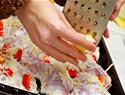 3. reduce to small shreds or pulverize by rubbing against a rough or sharp perforated surface