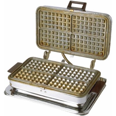 the appliance usually consists of two indented metal pans hinged together so that they create a pattern on the waffle